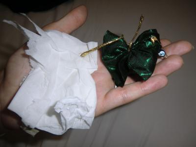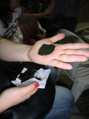Dann wurden kleıne Paeckchen mıt Pulver darın ın dıe Menge geworfen. Wenn man dıeses mıt Wasser vermısct erhaelt man eıne gruene Paste (Henna). Zweı Frauen sınd mıt eıner ganzen Schale davon rumgelaufen und haben jeder Frau, dıe wollte, eınen Klecks auf eın Tuch gegeben. Davon hat man sıch dann eın wenıg ın eıne Handflaeche geschmıert. Natuerlıch habe ıch das auch gemacht...morgen frueh soll ıch es abwaschen.